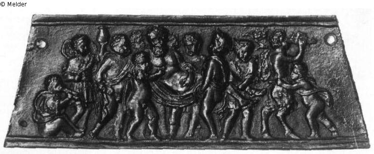 Trapezförmige Plakette, oben und unten profilierte Leisten, in den Ecken vier Durchbohrungen. Ein Zug von nackten und halbbekleideten Kindern trägt den Silen nach rechts. Voran zieht ein die Panflöte blasender Satyr, dem sich ein Putto entgegenstellt. Hinten folgt ein Kind, das eine Vase emporhält. Ein anderes sitzt ganz rechts und bläst einen Doppelaulos. Die Plakette wurde zusammen mit zwei anderen Szenen, einem "Bacchanal" und einer "Allegorie des Schicksals", als Seitenteil eines Tintenfasses in der Skulpturensammlung der Berliner Museen (Goldschmidt 1914, Nr. 246), eines Sandgefäßes in der Kress Collection in Washington (Pope-Hennessy 1965, Nr. 482) oder auch eines Kandelaberfußes verwendet (TNG I 1836). Der sitzende Knabe stimmt fast überein mit dem Putto, der auf dem Gesims der Tabernakeltür des Riccio in der Akademie zu Venedig erscheint.