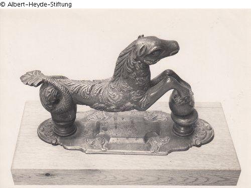 Nach der antiken griechischen Überlieferung war der Hippokampos ein Seepferd mit Fischschwanz. Er verkörperte die rollenden Wogen des Meeres. Hier erscheint ein Hippokampos als Türklopfer. Um anzuklopfen hob man den Körper an und ließ die Kugel, die er mit den Vorderhufen hält, auf einen Messingknopf fallen. Wahrscheinlich von der Tür eines barocken Prenzlauer Bürgerhauses.