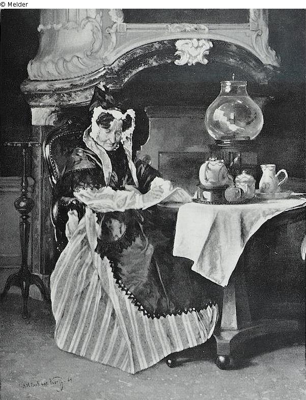 Ein Interieur mit einer älteren Dame, die an einem Tisch liest und döst, auf dem ein Teeservice und ein Goldfischglas stehen. Rückseitig vom Künstler beschriftet, datiert 22. Juni 1869