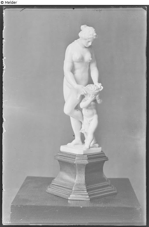 Venus ganz nackt, den linken Fuß auf einen Baumstamm gesetzt, verbindet Amor die Augen. Untersatz aus vergoldetem Kupfer.