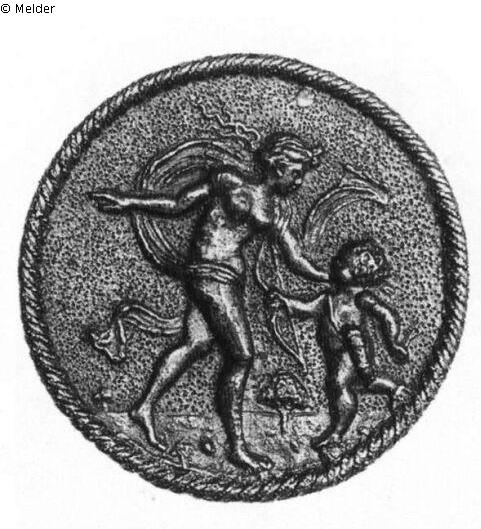 Runde Plakette, rings Taurand, oben eine Durchbohrung. Venus, nur von einem schmalen Schleier umflattert, schreitet nach rechts und greift an Amors Kopf, während sie mit der Rechten nach links deutet. Amor trägt Bogen und einen Pfeil in den Händen, den Köcher hat er umgehängt. Unten erkennt man Blumen und einen Baum. Das Feld ist punziert. Von Molinier und Bode wurde diese relativ seltene Plakette dem Moderno zugeschrieben.