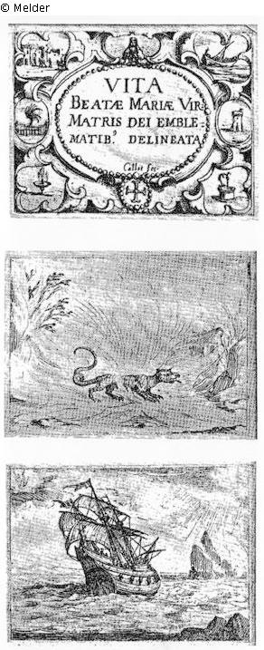 Deckblatt mit 24 Folgeblättern. Am Titelblatt: VITA BEATÆ MARIAE VIRGINIS MATRIS DEI EMBLEMATIBVS delineata – VIE DE LA BIEN-HEVREUSE VERGE MARIE MERE DE DIEV. Representée par Figure Emblematiques, dessigneées & grauées par Iacques Callot – A PARIS. Die einzelnen Folgeblätter: Der Salamander in den Flammen, Schiff im Sturm, Morgengrauen, Der Adler und sein Junges, Der Paradiesvogel, Die Weinrebe, Der Geier, Zwei Palmen, Der Gärtner, Die Hirschkuh, Die Auster mit der Perle, Sonnenstrahlen, Der Perlenwäscher, Löw und Löwenjunges von den Jägern verfolgt, Die Delphine und das Krokodil, Das Lamm sucht sein Junges, Die Jägerin, Die Hirschkuh betrauert ihr Junges, Die Löwin betrauert ihr Junges, Die Taube in der Wüste, Die Arche Noah, Der Gärtner, Der Mann am Feuer, Regen und Sonne, Die beiden Kronen, Nilüberschwemmung in Ägypten.