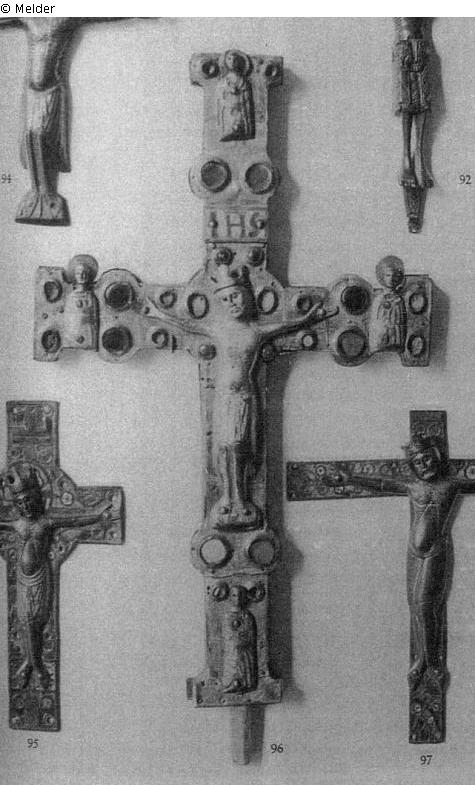 Vortragskreuz; 12.Jh., Grubenemail, Goldblech auf Holzkern (Helbing: Kreuz vergoldet und graviert, mit Glaseinlagen, trägt an den vier Enden die emaillierte Halbfigur von anbetenden Engeln. Korpus Christi mit vergoldeter Krone und emaillierten Lendentuch. Rückseitig an den Enden die emaillierten Symbole der Evangelisten, in der Mitte Kreisplatte mit Darstellung der Auferstandenen. Kupfer, vergoldet und emailliert. H 40,5 cmit Ähnliches Kreuz in Cluny-Museum, Paris)