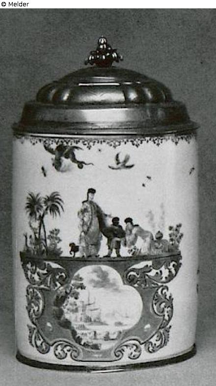 mit silbervergoldetem Deckel und Fußring. Auf der Stirnseite über einer Purpurlüsterkartusche, in die in Purpurcamaïeu eine Landschaft gemalt ist, in bunten Farben eine Chinesenszene, daneben Hirsche unter Palmen, darüber Drache und Vogel. Bunte indianische Blumen. Goldspitzenkante. Schwertermarke. Meißen, um 1730. Literatur: Auktionskatalog Hans W. Lange, Wertvolles Kunstgewerbe, Berlin, 19.-21. Mai 1941, S. 103. Nr. 486, Taf. 66 (DOI: Externer Link)