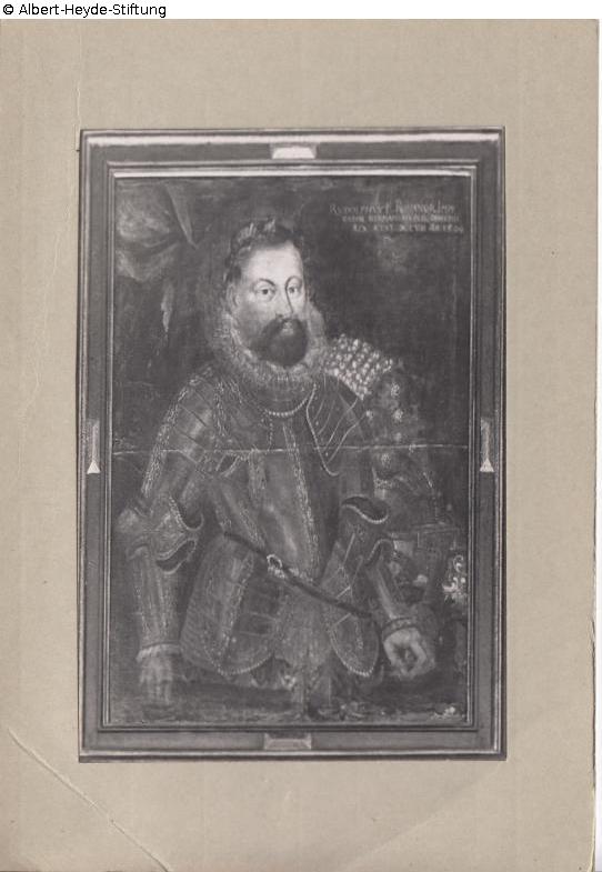 Gerahmt. Bildnis in Halbharnisch mit Lorbeerkranz, rechts oben bezeichnet: “RVDOLPHVS ROMANOR. IMPE / RATOR GERMAN. HUNGAR. BOHEMIE / REX AETAT. XLVII Ao. 1599”. Das Gemälde zeigt den einstigen Landesherrn der böhmischen Lausitz. Es war ausgestellt im Zunftsaal des ehem. Gubener Stadtmuseums.