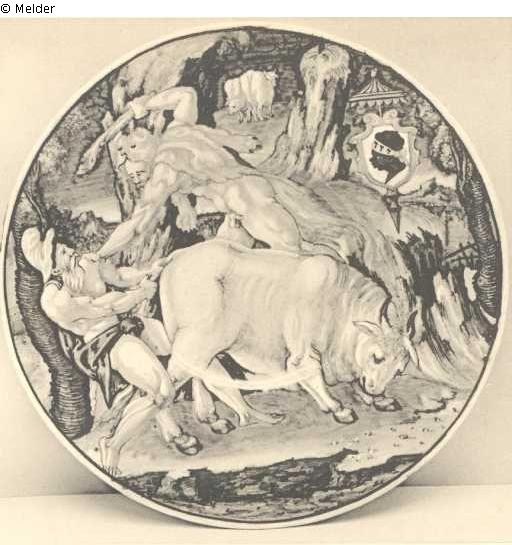 Wappenteller mit Cacus die Ochsen des Herkules stehlend