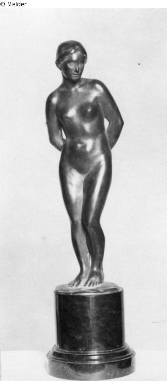 Das jugendliche Weib steht in leicht bewegter Haltung aufrecht, die Hände auf dem Rücken ineinander gelegt. Statuette.