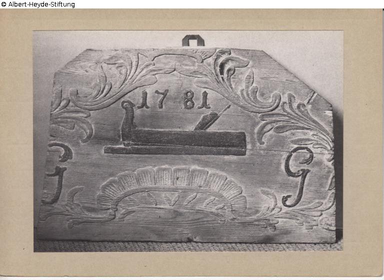 Rechteckiges Brett mit abgeschrägten oberen Ecken. Rahmen aus in Flachrelief ausgeführtem barockem Ornament (Muschel, Akanthus), darin ein Hobel mit Jahreszahl der „1781“. Links und rechts das Monogramm „G / G“. Das Schild bezeichnete die Tischlerei G. Gaßow in der Trebbiner Straße 23 in Luckenwalde.