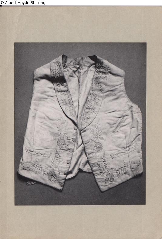 Elfenbeinfarbene Weste mit weißseidener, floraler Stickerei auf den Revers, entlang der Knopfleiste und der Unterkante. 1820 als Hochzeitsweste getragen.