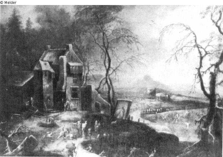 To the left on a hillock, among trees, is a building with a snow-covered roof. Before it are many figures in bright clothing. At the bottom is a frozen stream. A tall bare tree to the right.
