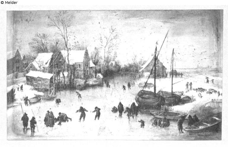 Zugefrorener Kanal mit Schlittschuhläufern (Winterlandschap, rechts varkens in sneeuw)