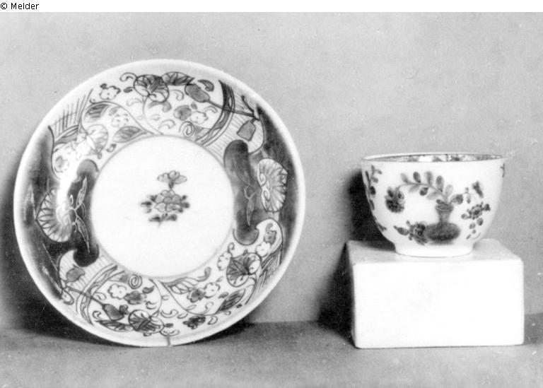 Bemalt in Unterglasur blau und eisenrot und gold über der Glasur nach Art japanischer Porzellane. Die Koppchen mit Schwertermarke. Untertassen China, 18. Jhdt. Tassenhöhe: 4 cm, Untertassen Durchm.: 12 cm