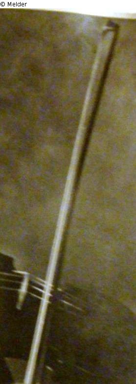 Dunkelrotbraune kantige Stange mit Astfleck ca. 2 Handbreit vom unteren Ende rechts, Frosch mit Bahn ohne Metallschiene, Schraube, Silberplättchen unterhalb des Schubes mit 3 Nägelchen. Höhe 74-75 cm.