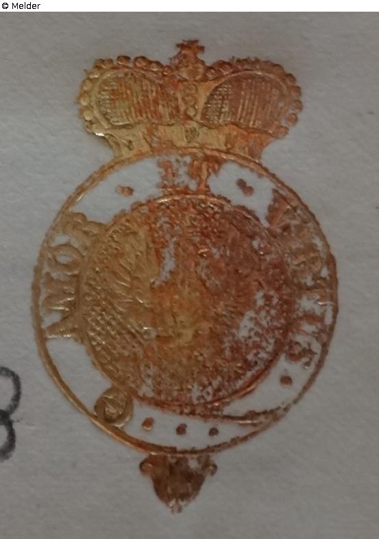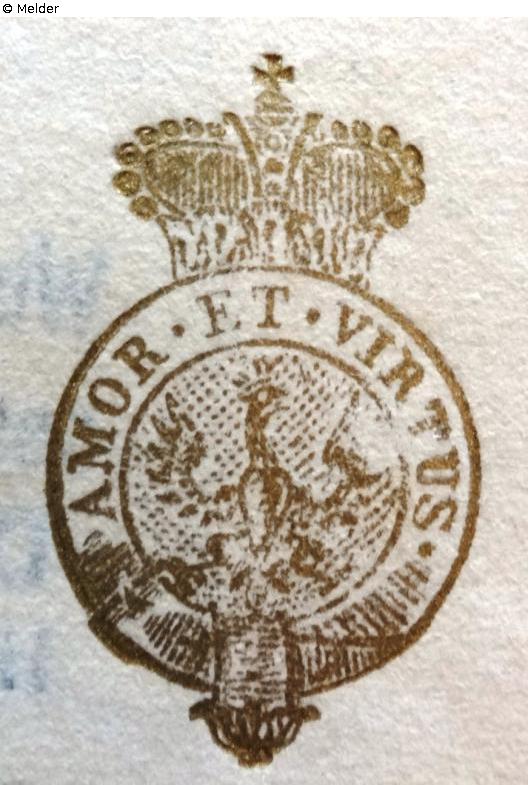 Kreisförmiges Wappen mit Fürstenkrone, im Wappen Adler und umlaufendes Spruchband mit dem Spruch „AMOR ET VIRTUS“Gold, auf verschiedenen Vorlagen