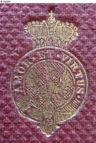 Kreisförmiges Wappen mit Fürstenkrone, im Wappen Adler und umlaufendes Spruchband mit dem Spruch „AMOR ET VIRTUS“Gold oder Schwarz