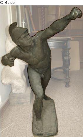 Young warrior dressed with helmet and belt, otherwise naked; body bent forward on the right leg, arms in the position of a shooting bow, arrow (?) and bow missing. Signed on the base: Professor Victor H. Seifert
