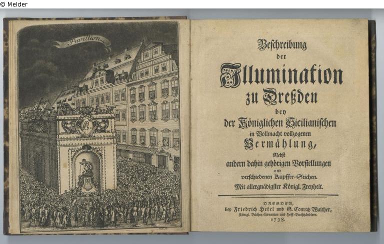 Beschreibung der Illumination zu Dreßden bey der Königlichen Sicilianischen in Vollmacht vollzogenen Vermählung, Nebst andern dahin gehörigen Vorstellungen und verschiedenen Kupffer-Stichen