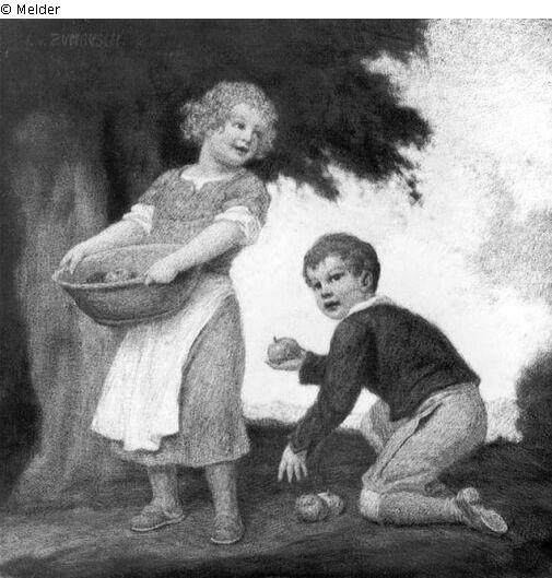Found-Object Report | Object report Boy and girl picking up apples Lost Art-ID565743 Previous Next Artist / Creator Zumbusch, Ludwig von Birth 1861.07.17, München Death 1927.02.28, München Place of activityWien TitleBoy and girl picking up applesObject typePaintingGroup of reported objectsPaintingMaterial / TechniqueOil ; Panel / painted Height 40.00 cm Width 39.00 cm Inventory numbermü2358/1Description Signatur: L. v. Zumbusch; Links das Mädchen mit Korb sich nach dem am Boden knienden Jungen (im Profil nach links) umsehend. Knabe schaut nach vorn. Links der Baum. Read more Read less Holding Kulturgüter aus dem ehemaligen ReichsvermögenPublished since13.12.2016 Contact Kunstverwaltung des Bundes Herbert-Bayer-Straße 5 13086 Berlin Germany E-Mailprovenienzforschung@kvdb.bund.deHomepagehttp://www.kunstverwaltung.bund.de
