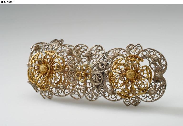 Filigree silverwork in various flower shapes with a convex upper side, the edges curved and jagged. Two multi-layered gold-plated rosettes on the left and right. In the middle a small rosette, framed by a filigree arch, around the rosette small silver beads. Under the needle hook.
