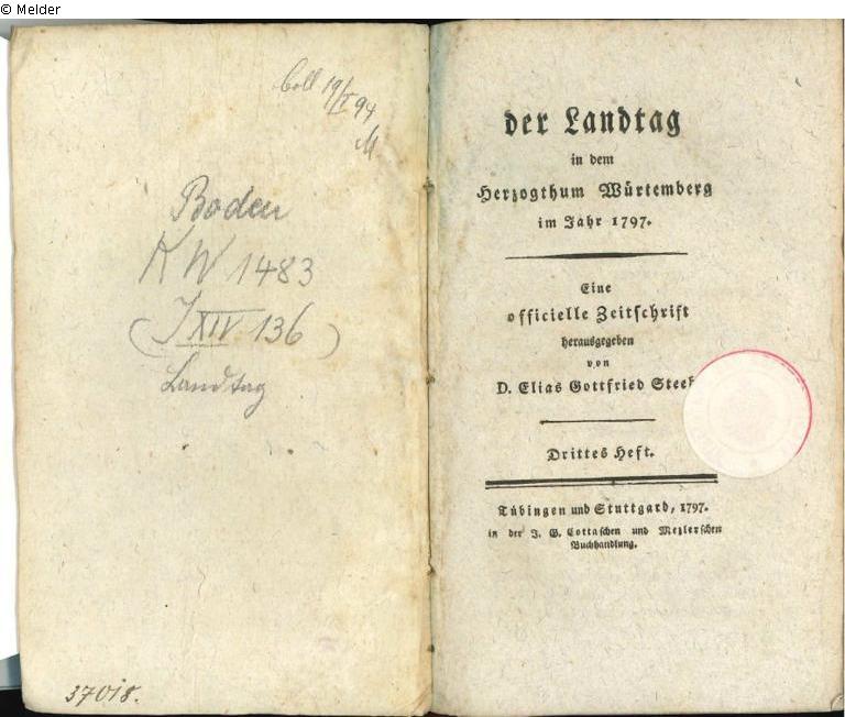 Eine offizielle Zeitschrift herausgegeben von Dr. Elias Gottfried Steeb. Zur Aufbringung der Kriegsentschädigung und Kriegskosten wurden die Stände einberufen, die im „Reformlandtag" (1797-1799) zunächst die entartete Ausschussoligarchie stürzten. Über