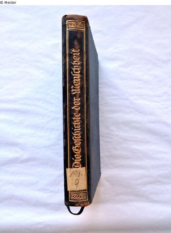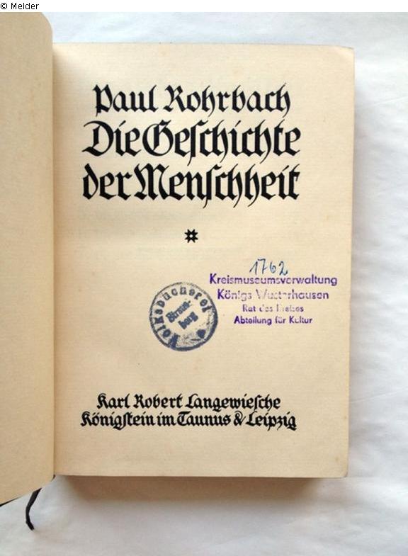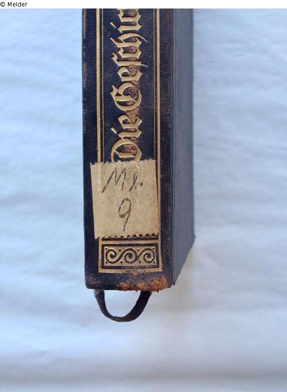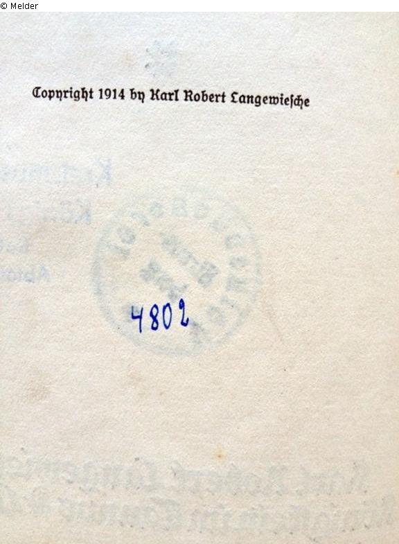 auf Buchrücken: "Mb.9" [braune Tinte, Signatur, Aufkleber], auf vorderem Einbanddeckel, innen: "Mb 9" [roter Stift], auf Schmutztitel: handschr. Vermerk "Eigen[tum?] [...]er [...] 17. IV. 1915 [...]" [braune Tinte, getilgt], auf Titelblatt: "4802" [blaue Tinte, Signatur der Volksbücherei Strausberg], "1762" [Kugelschreiber, Signatur des Kreismuseums Königs Wusterhausen]