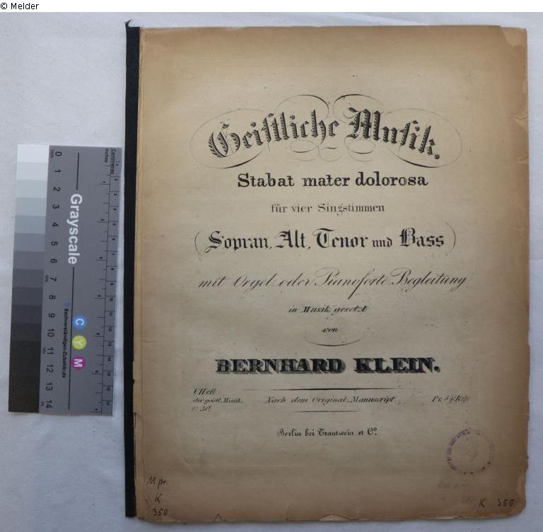 Circular stamp: "Musikwissenschaftliches Institut der Universität Köln"; stamp: "Musikwissenschaftliches Institut der Universität Köln"; handwritten inventory number: "116[]";