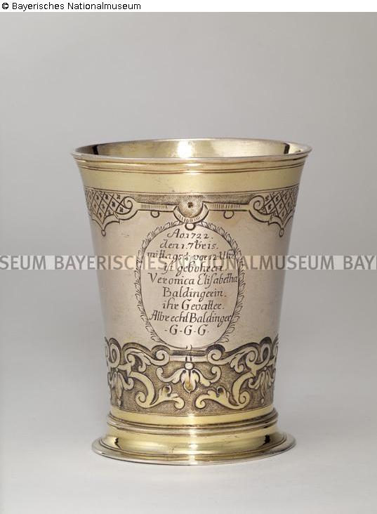 Findings: On the underside of the bottom: Maker's mark 'P.S in two-pass (lying)', for Philipp Stenglin (master 1693, died 1744); Hallmark 'Pyr', for Augsburg, before 1722; assayer's mark (Tremolierstich); handwritten with red color "64/34" (Inv. No. of the Bavarian National Museum). On the outside of the wall: engraved coat of arms 'Rising greyhound in obliquely divided shield' (full coat of arms of the Augsburg Baldinger family); Engraved dedication "A.O. 1722. dem 1.7bris mittags 1/4 vor 12. Uhr ist gebohren, Veronica Elisabetha Baldingerin. ihr Gevatter. Albrecht Baldinger. G.G.G." ./A.G., 2018