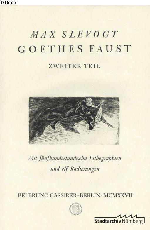Found-Object Report | Object report Goethes Faust. Zweiter Teil. Folio edition in original slipcase Lost Art-ID630887 Previous Next Artist / Creator Slevogt, Max Birth 1868.10.08, Landshut Death 1932.09.20, Neukastel (Pfalz) Place of activityMünchen; Neukastel (Pfalz) TitleGoethes Faust. Zweiter Teil. Folio edition in original slipcase Dating1927Object typePrintGroup of reported objectsGraphicMaterial / TechniquePaper / printed Height 31.70 cm Width 24.70 cm Inventory numberGr. A. 1484Provenance purchased in 1944 by Art trade Otto Fischer, Obernstraße 47, Bielefeld Read more Read less Published since04.09.2025 Contact Museen der Stadt Nürnberg Direktion Hirschelgasse 9-11 90403 Nürnberg Germany E-Mailmuseen@stadt.nuernberg.de Contact Stadtarchiv NürnbergPositionProvenienzforschungPhone0049 (0)911 231-2770E-Mailstadtarchiv@stadt.nuernberg.de
