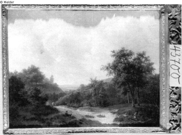 Found-Object Report | Object report Landscape with facade Lost Art-ID219720 Previous Next Artist / Creator Koekkoek, Barend Cornelis Birth 1803.10.11, Middelburg Death 1862.04.05, Kleve Place of activityHilversum; Beek (Nymwegen); Kleve TitleLandscape with facadeObject typePaintingGroup of reported objectsPaintingMaterial / TechniqueOil ; Canvas / painted Height 53.00 cm Width 66.00 cm Inventory numbermü43700Description Signatur B.C.Koekkoek; Breiter Waldweg nach links hinten, vorn links am Weg Schäfer m.Hund sitzend, auf Weg hinten Wa-gen. Im Hintergrund Blick ins Tal Read more Read less Holding Kulturgüter aus dem ehemaligen ReichsvermögenProvenance Access 1944 Read more Read less Published since2001 Contact Kunstverwaltung des Bundes Herbert-Bayer-Straße 5 13086 Berlin Germany E-Mailprovenienzforschung@kvdb.bund.deHomepagehttp://www.kunstverwaltung.bund.de