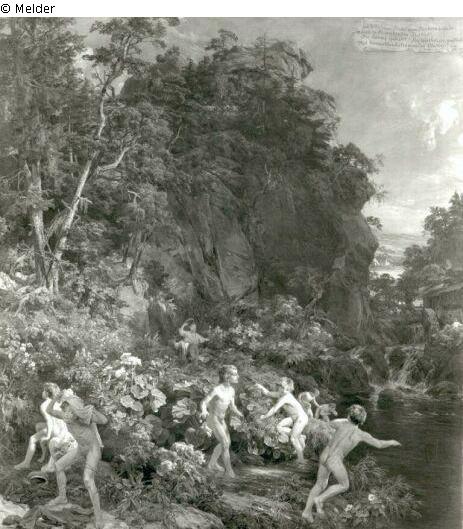 Mountain landscape with bathing boys