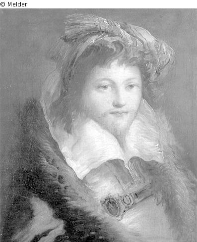 (für Würzburg) Der junge Mann nach halbrechts aus Bild schauend, mit großem Kragen und Barett auf dem Kopf.