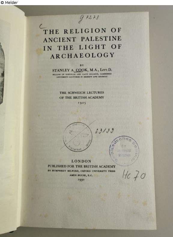 Found-Object Report | Object report The Religion of ancient Palestine in the light of archaeology Lost Art-ID632670 Previous Next Author Cook, S. Publisher Milford TitleThe Religion of ancient Palestine in the light of archaeologyPlace of releaseLondon Date of publication1930Object typeBookGroup of reported objectsLibrary objectsSignature1207/Hc 070Description stamp „Reichsinstitut für Geschichte des neuen Deutschlands“ (G7273/23133 ). Read more Read less Published since28.10.2025 Contact Ludwig-Maximilians-Universität Institut für den Nahen und Mittleren Osten Bibliothek Veterinärstr. 1 80539 München Germany Phone0049-89-2180-3039Homepagehttps://www.naher-osten.uni-muenchen.de/institut/bibliothek/index.html Contact Prof. Dr. Ronny VollandtPositionProfessor für JudaistikE-Mailronny.vollandt@lmu.de