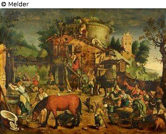 Vorn links Brunnen, rechts daneben saufendes Pferd, rechts Kartenspieler am Tisch. Reiche Staffage. Links im Mittelgrund Christus mit den Jüngern. Hinten auf der Anhöhe, die von einer Hütte verdeckt wird, großer Rundturm.