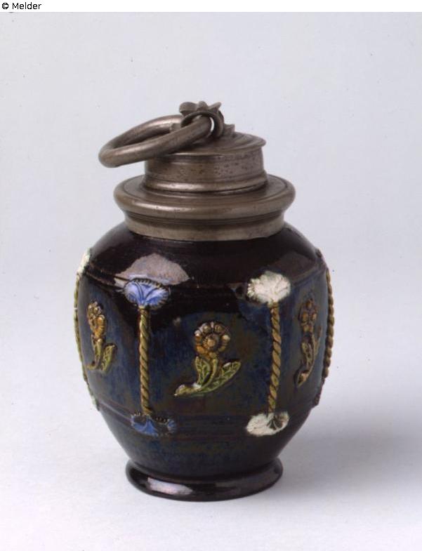 Black glazed stoneware screw, hexagonal. At the edges white and blue flowers on corked green stems; in the fields green flowers. Pewter mounts. On the unglazed underside inscription with black lacquer pen (?) "F. 4379." [= presumably Inv no. of the Schlossmuseum Berlin, so-called "F[igdor]-Inventar" ca. 1935]