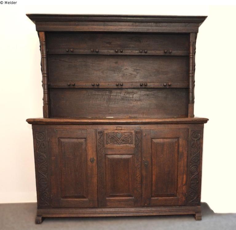Dark oak sideboard with open top. The cabinet has a non-continuous shelf in the base, two doors and a drawer with profiled filling and vertical strips of carved decoration. The lower body and drawer are decorated with carved flowers and tendrils. The body is set back and divided into two plate shelves (grooves for plates) and stands on two posts. The sides of the body are curved, the posts are turned round. The cabinet is equipped with metal fittings and bands.