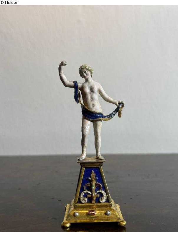 Enamelled Venus statuette on a vermeil-set, ornamented lapis lazuli pedestal decorated with pearls and rubies. Base: remnants of a sequence of numerals in red.