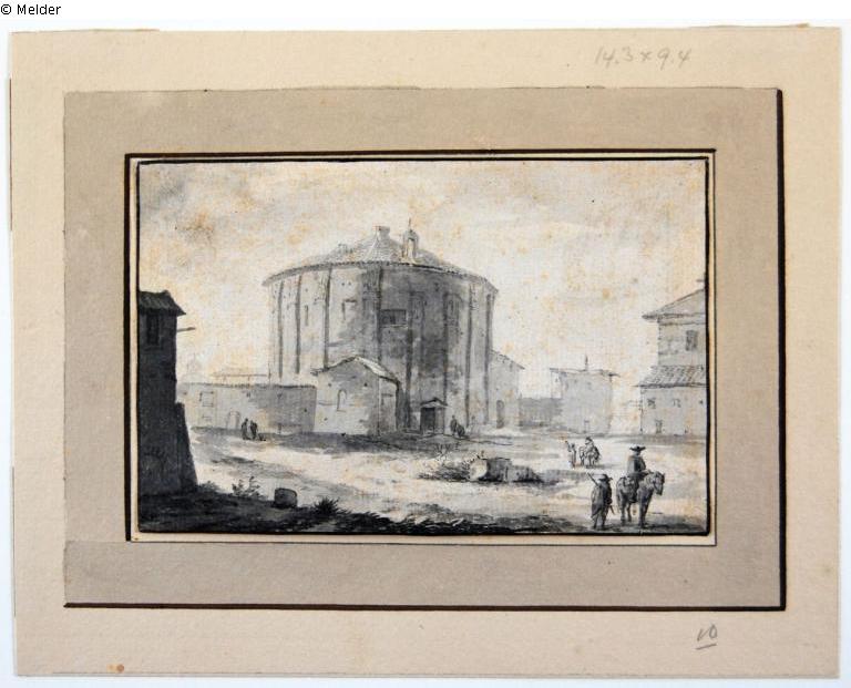 Several staffage figures; in front right two men, one of them on a donkey