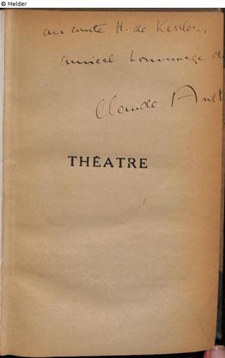 Dedication Author: "au comte H. de Kessler, amical hommage de Claude Anet", half-title page