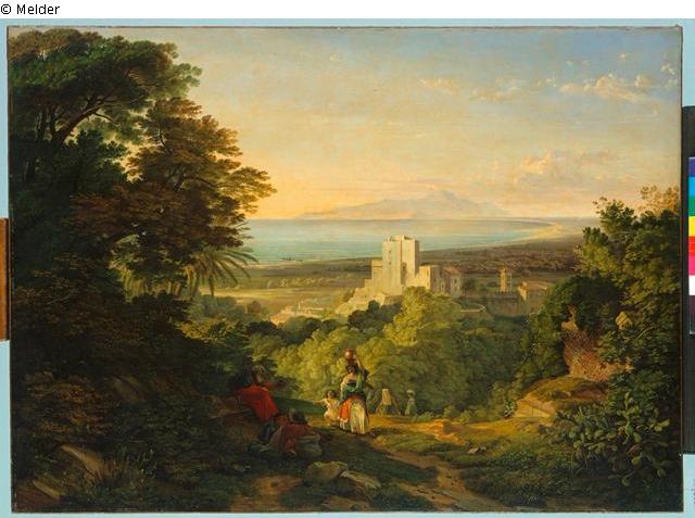 From an elevated vantage point, the view wanders over a group of figures in the foreground - two resting pilgrims, a woman with a pitcher on her head and a child, and a little further back two other women - to the city view of Terracina over the sea inlet central ground, in the background to Monte Circeo.