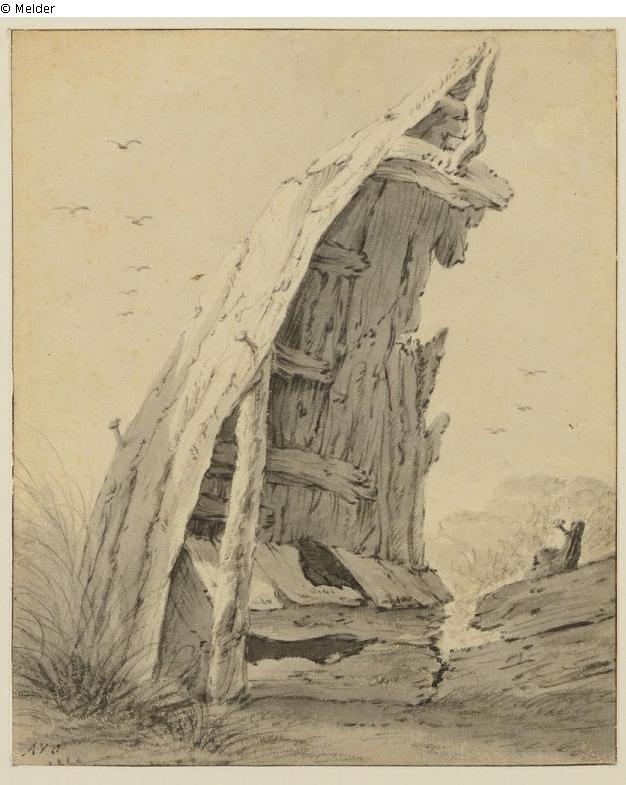 Erected, destroyed boat; signed "AVO
