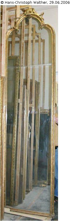 Mirror frame poliment-gilt ( overpainted). Contemporary objects from the second half of the 18th century in typical rococo style. Rectangular mirror with curved top, gilded wooden frame with surrounding frieze in the shape of carved notches, top with sculptural carving: fruit, foliage and scrollwork. Mirror glass divided into two parts.