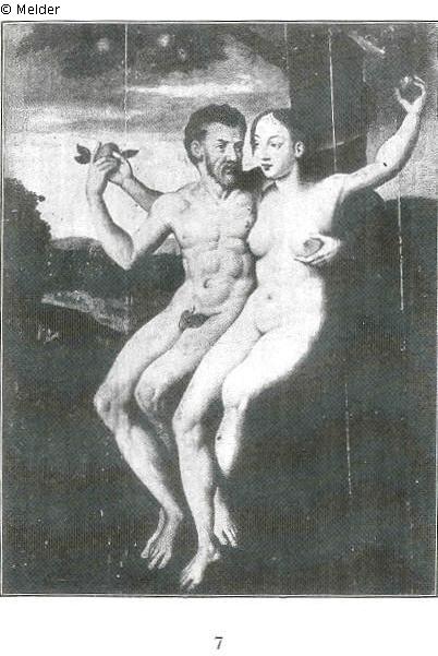 SNK Stavenhagen: ""schwarzer Rahmen, mit goldenem Rand. Adam und Eva sitzen unter einem Baum, Adam hält seinen linken Arm um Eva und hält einen Apfel in der rechten Hand. Evas linker Arm ist hoch in den Baum gestreckt. Adams Körper ist im Kontrast zu Evas weißem wesentlich dunkler."; Malmedé & Geissendörfer: Sammlung wertvoller Gemälde alter Meister aus größtensteils süddeutschem Privatbesitz, vorwiegend altflämische und altholländische Schule bis zum Ausgang des siebzehnten Jahrhunderts. Auktion vom 14.11.1917. Köln 1917. Kat. Nr. 7.
