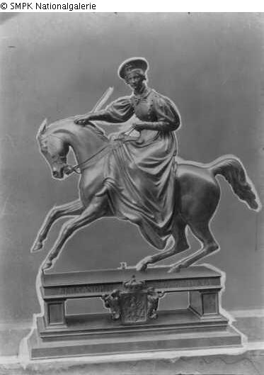 Sculpture in the round: sculpture in the round: equestrian figure: riding on a horse, donkey, mule, etc.; female rider & horse: height is questionable.