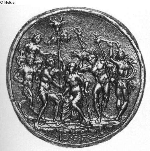 Runde Plakette, einfache Randkrempe. In der Mitte der Szene sitzt die fast nackte Ariadne und stützt sich auf ein Ruder. Um sie herum tanzen drei Männer mit bacchischen Attributen. Der linke Tänzer ist mit einem Lendentuch bekleidet und trägt eine Stange, an der oben die Köpfe von einem Stier, einem Eber und einem Löwen angebunden sind. Der mittlere Bacchant ist nackt, er hält eine Fackel in der Hand und trägt auf dem Kopf einen Gegenstand, der mit einer Amorstatue geschmückt ist und wohl den Bug eines Schiffs vorstellen soll. Der rechte Tänzer hat sich ein Widderfell um den Leib gebunden und entzündet seine Fackel an der des anderen. Von links tritt ein Satyr heran, der ein Satyrweib auf den Schultern trägt. Unten erscheint die Signatur ? IO? F ? F ??Die Plakette ist sehr häufig in Sammlungen vertreten. Die Szene findet sich oft auf Schwertknäufen kombiniert mit anderen Arbeiten desselben Meisters, auf Nielli und als Ätzung auf einem Kurzschwert der Wallace Collection in London (vgl. auch das Relief auf der Lederscheide des Cesare Borgia im Victoria and Albert Museum in London) und auf den Rückseiten der Medaillen auf Heinrich II. von Frankreich und auf den Mailänder Rechtsgelehrten Gianbattista Salvatorini. Zwei der Figuren kehren auf einem Druck des Robetta wieder, der nach 1506 datiert wird.