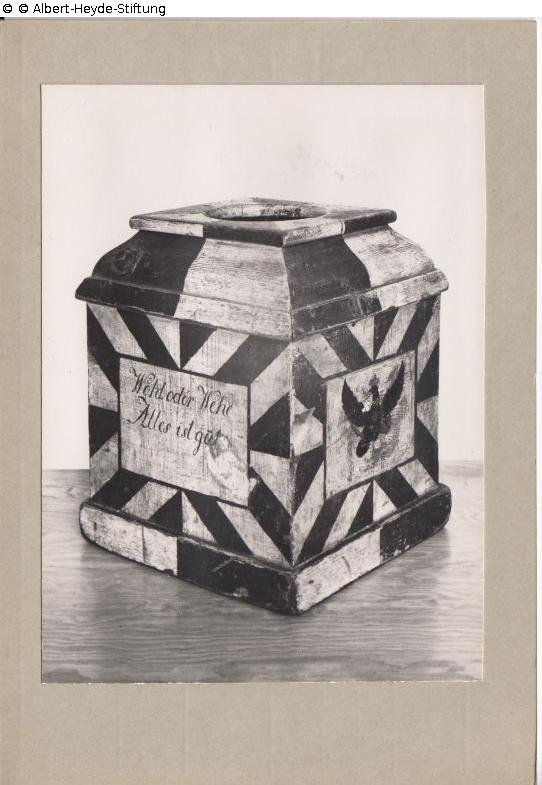 Square wooden box with carney-shaped top plate and round opening. Painted in the black and white Prussian colors. Rectangular white fields on the side walls with inscriptions or signs: Prussian eagle; "Loosung"; "Wohl oder Wehe / Alles ist gut"; "Lübben Beeskower Kreis".