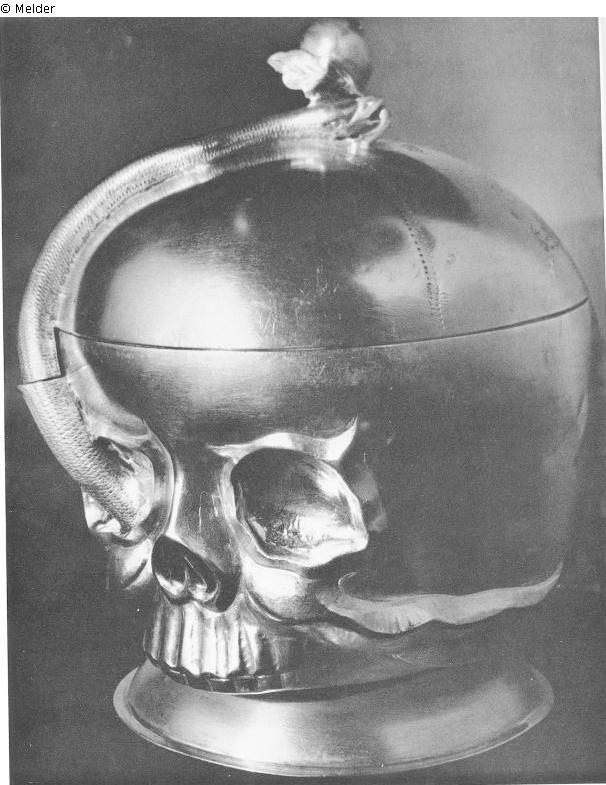 A gilt silver skull-shaped beaker, with a snake motive. The snake holds an apple in its mouth. Memento-Mori symbolism of the Baroque. Engraved inscription: Dedekindisches Ahndänkken der Stärblichkeit. 1714. / Gestern galts mihr heute gilts dihr. From the property of the Kramer's Guild. Dresden assay mark, numberd 12 and a maker's mark.
