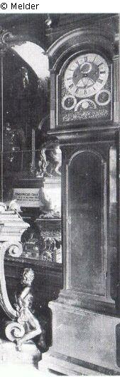 Pendant zu IX 116. Eine große englische Spieluhr, in einem, mit Nussbaum furnierten Gehäuse, oben mit drei metallischen, vergoldeten Knöpfen, sign. "Claudius Du Chesne Londini fecit".