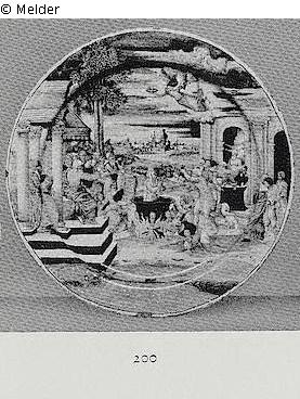 painted with Martyrdom of St. Cecilia (after Marc-Anton-stitch, Bartsch 117). In the middle of the boiling cauldron naked saints, on the rigth side the heads of Valerian and Tiberius. A little bit damaged at the edge. Reference: Paul Graupe: Gemälde, Kunstgewerbe aus verschiedenem Besitz, Ostasiatisches Porzellan aus dem Besitz der Prinz-Albrecht-Linie des vormals Preußischen Königshauses und aus drei Privatsammlungen. Auktion vom 20. und 21.10.1936. Berlin 1936.