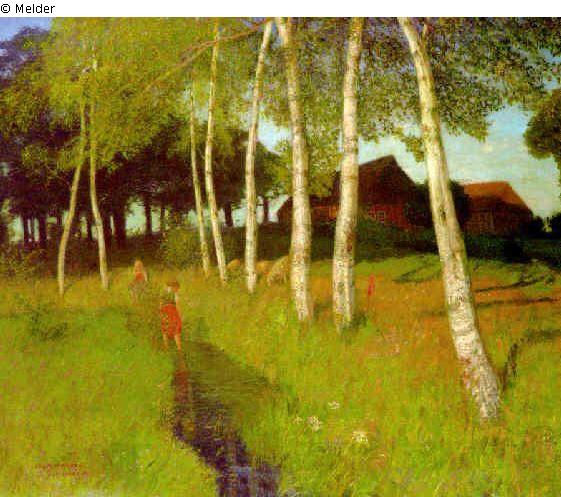 Birken am Bach bei Worpswede. Rechtes Wiesenufer, sonnenbeschienene Birken. Laubbäume, Gehöft. Staffage. Links unten in rot: Otto Moderesohn Worpswede 94