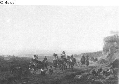 WV Bühler/Krückl: 489; Ziehende Landleute vor Rom. Auf einer Strasse der Campagna ein Trupp Landleute, vornher eine Tambourinspielerin auf Maultier, begleitet von einem Dudelsackpfeifer. Blick auf das in bläulichem Dunst breit daliegende Rom und die Apenninen im Hintergrund